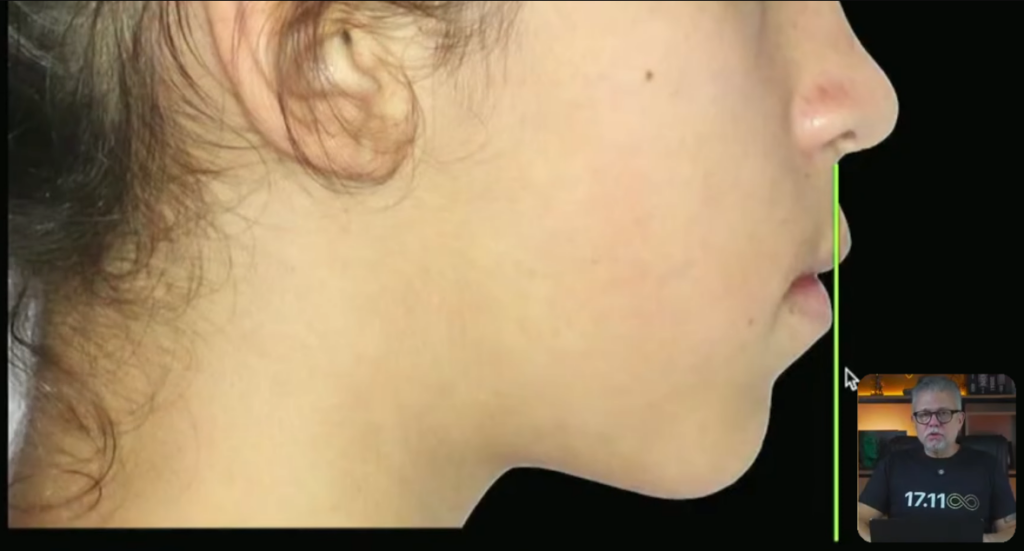 E aqui, no caso dela, quando nós olhamos a linha vertical subnasal, nós observamos que o lábio superior, ele está mais ou menos dois milímetros à frente da linha.